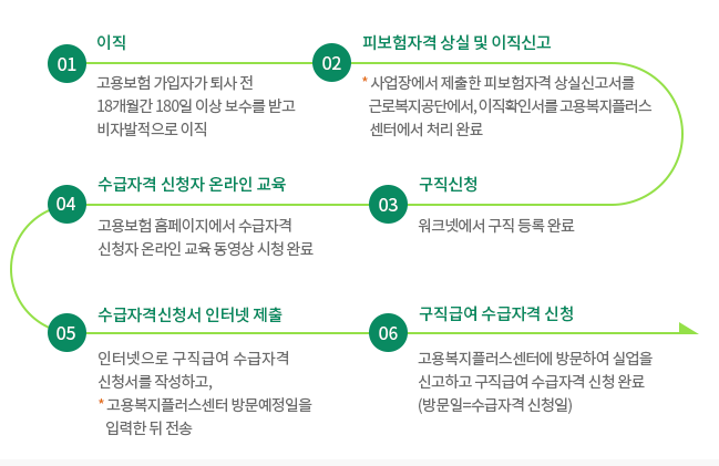 실업수급 조건에 해당되는 경우, 고용보험 홈페이지에서 수급자격 신청자 온라인 교육 동영상 시청을 완료한 후, 워크넷에서 구직등록을 하고 거주지 관할 고용센터를 방문해서 실업급여를 신청해야 합니다.