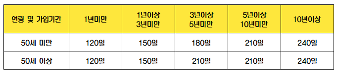 수급기간은 수급자의 연령 및 보험가입기간에 따라 정해집니다. 연령기준은 만 50세 미만과 이상으로 구분되며 장애인의 경우 만 50세 이상으로 간주됩니다.