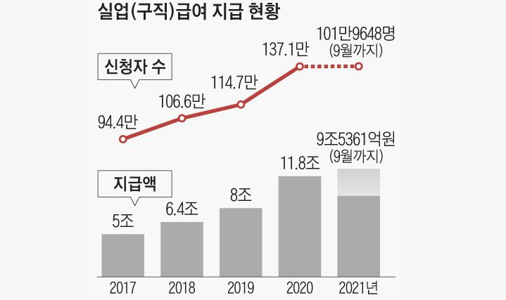 실업급여 여러번 신청 가능, 최저임금과도 月1만원 차이 근로의욕 없애 작년 137만명 신청, 11조 지급 2번 이상 타간 사람도 35만명