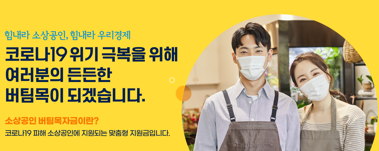 코로나로 어려움을 겪고 있는 소상공인들을 사업안정을 위해 금년 1월부터 버팀목자금을 추가로 지원하고 있습니다.