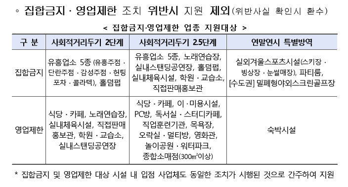 - 사행성업종이나 변호사, 회계사, 병원, 약국 등 전문직종, 금융이나 보험관련 업종 (단 유흥주점, 콜라텍은 집합금지 및 영업제한 업종에 포함되므로 지원대상에 포함됩니다)